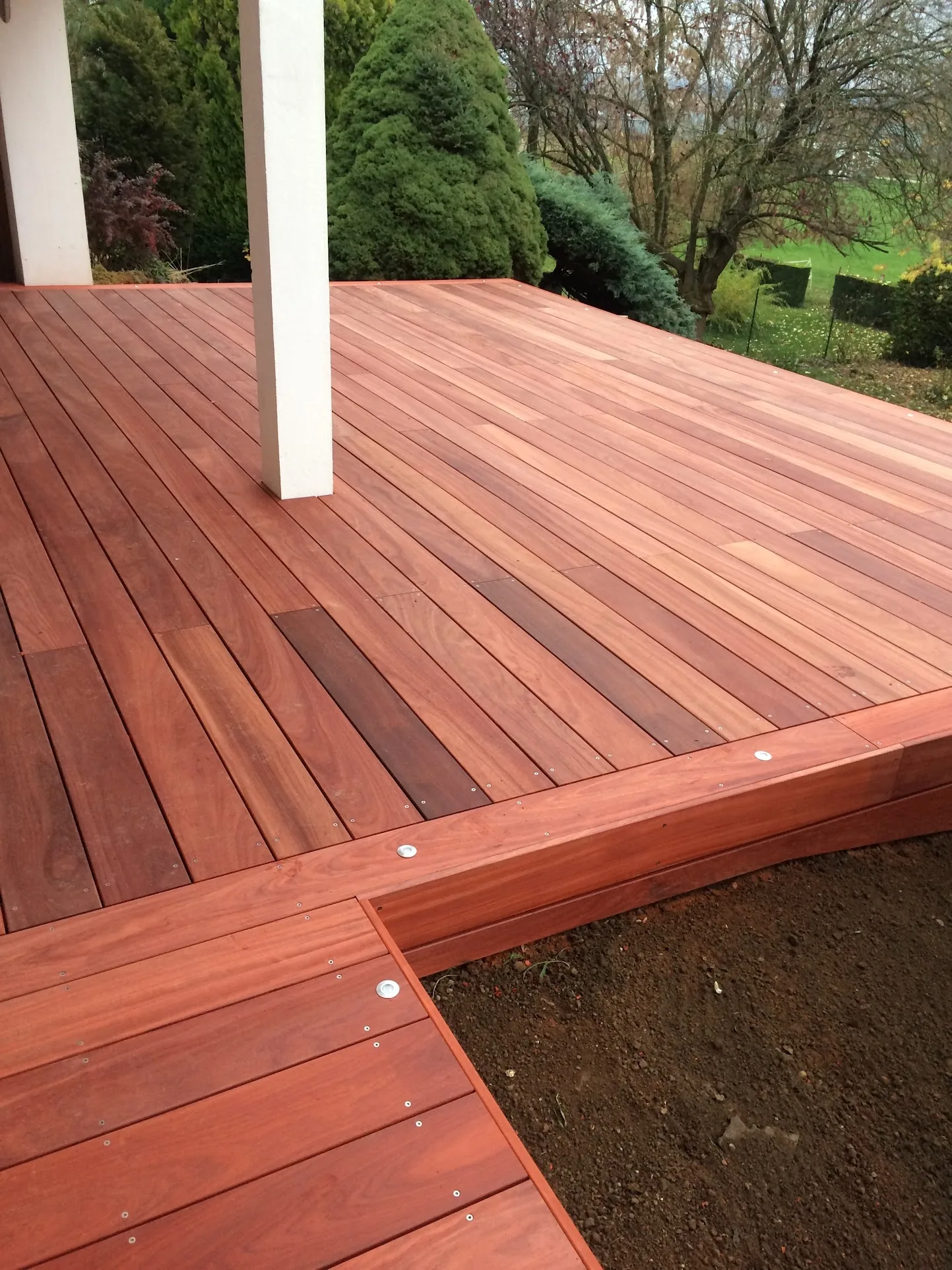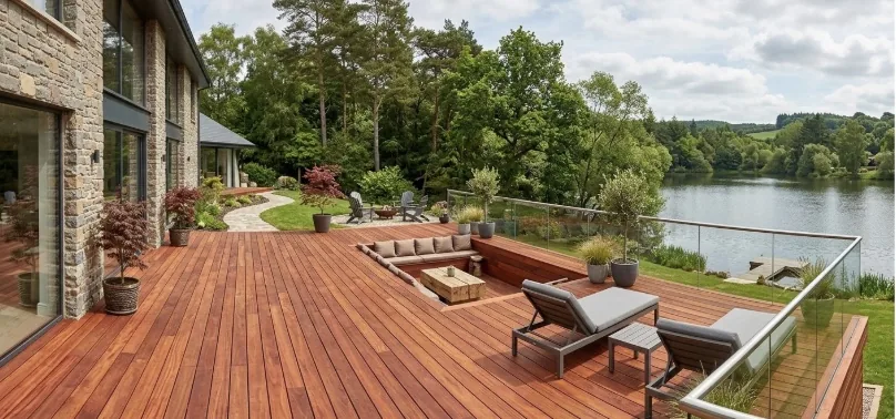 Le Padouk d'Afrique se distingue par sa couleur rouge corail éclatante qui évolue avec le temps vers un gris argenté très élégant. C'est une essence exceptionnellement stable, idéale pour les terrasses haut de gamme nécessitant une grande résistance aux intempéries. Bois exotique classe 4, extrêmement durable.